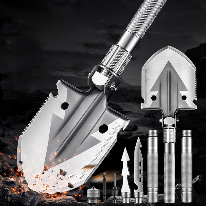R5: Esta pala ofrece una amplia gama de funciones más allá de una pala normal, que incluyen sierra, abridor de botellas, azada, gancho, martillo de seguridad, silbato y cortador de cinturón, lo que la convierte en una herramienta todo en uno para aventureros.