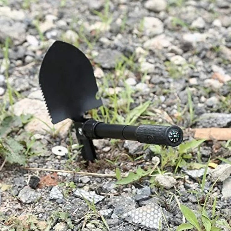 UBloqueo de mango único y diseño de cabezal de pala con cambio instantáneo - esta pala tiene barras de extensión y bloqueo de mango, por lo que la longitud del mango es ajustable según sus necesidades y no hay necesidad de preocuparse de que el mango se suelte. El cabezal de la pala tiene un botón de cambio instantáneo que permite cambiar el ángulo del cabezal de la pala rápidamente. También cuenta con una pala normal que ni siquiera tiene: sierra, abridor de botellas, azada, gancho, martillo de seguridad, silbato, cortador de cinturón